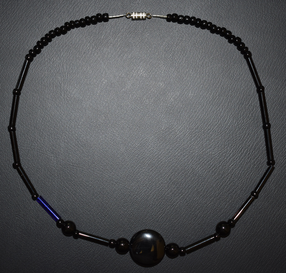 Designed by AT3META. This 17" strand features vintage black beads, and a flat round stone bead as it's centerpiece. With a durably fastened screw enclosure. Due to scarcity one of the long glass beads is dark blue.
