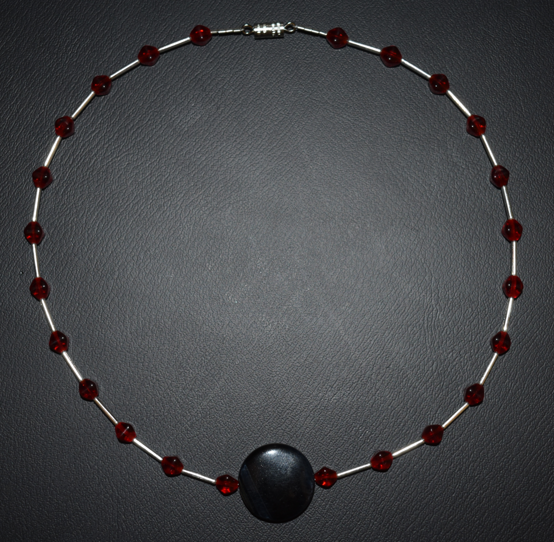 Designed by AT3META. Strung on metal with modern red glass beads, silver findings, and a flat stone circle black bead. Measure 16" in length.
