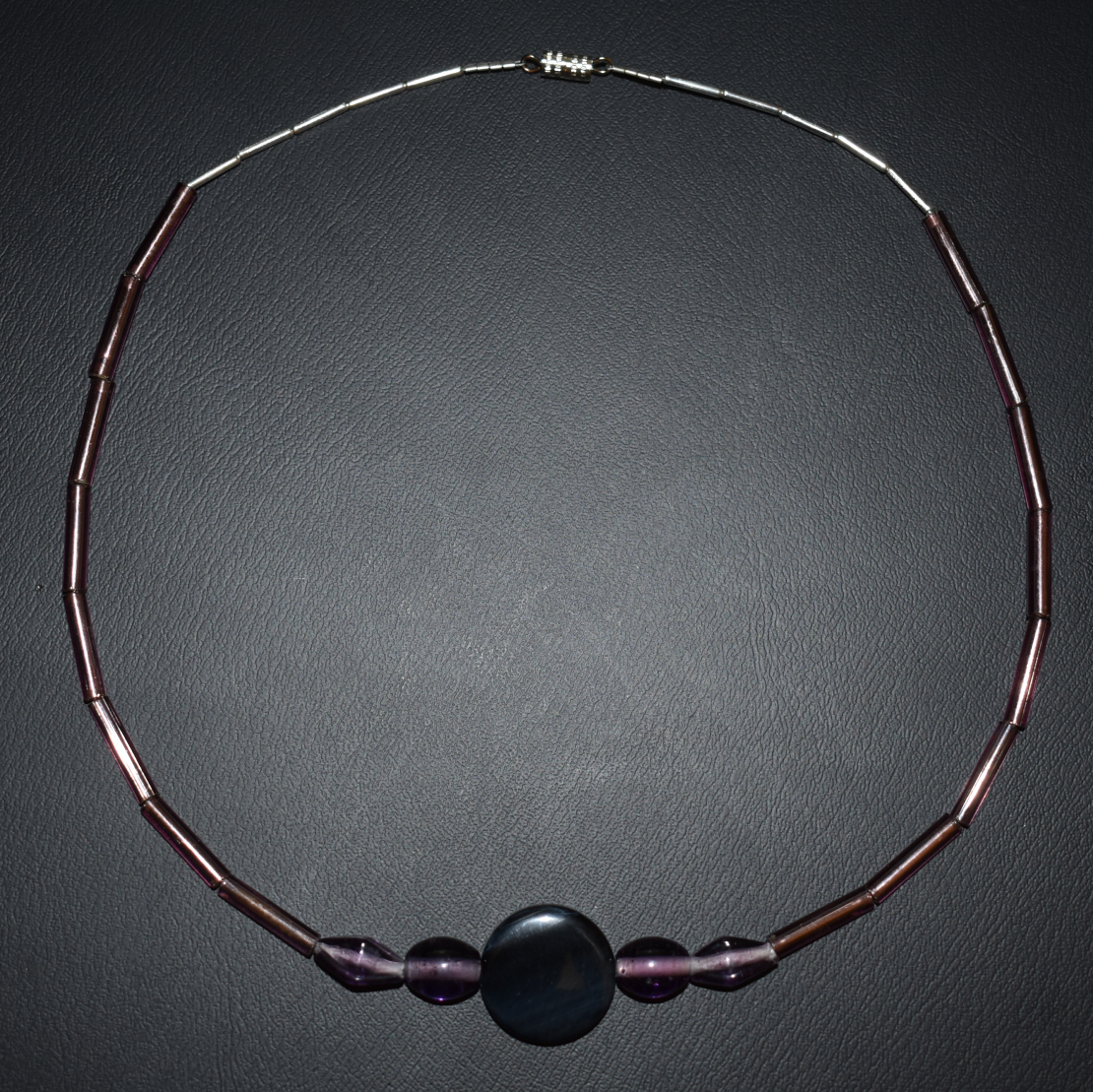 Designed by AT3META. This simple strand features vintage glass beads, silver findings, and a flat stone circle bead strung on metal. Has a durably fastened screw closure. Measures 16" in length.