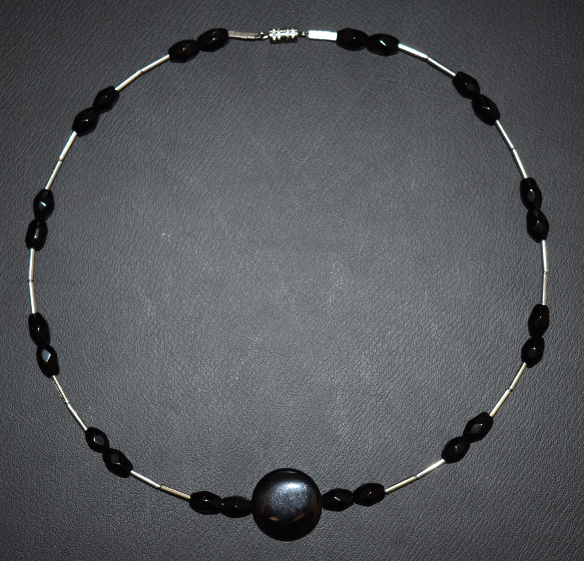 Designed by AT3META. This strand features vintage black glass beads, silver findings, and a flat stone circle bead. Measures 18" in length and has a durable fastened screw closure.