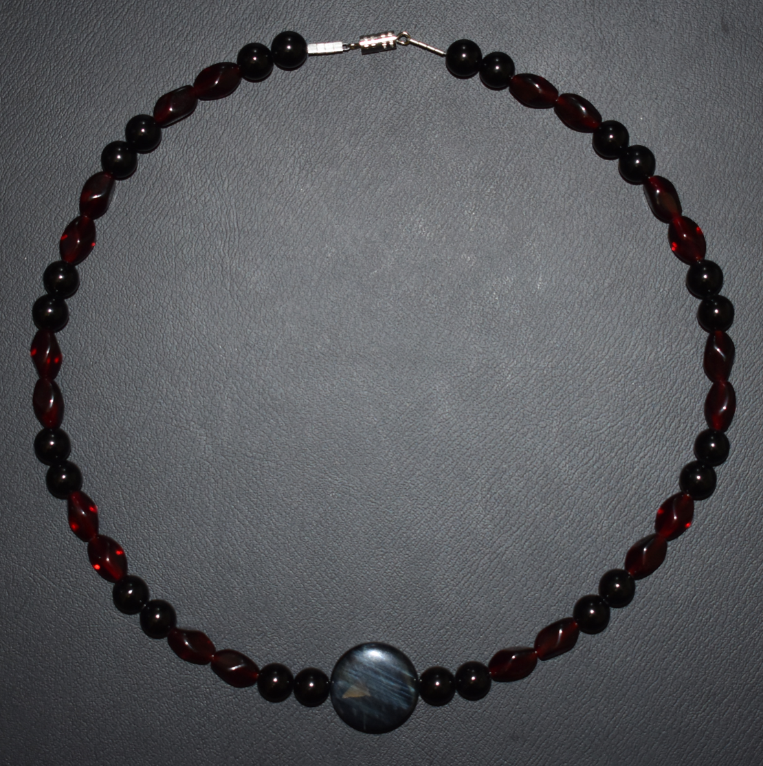 Designed by AT3META. This complex strand features modern red glass beads, black onyx beads, and a flat circle stone bead. Strung on metal with a durably fastened screw closure. Measures 18.5" in length.