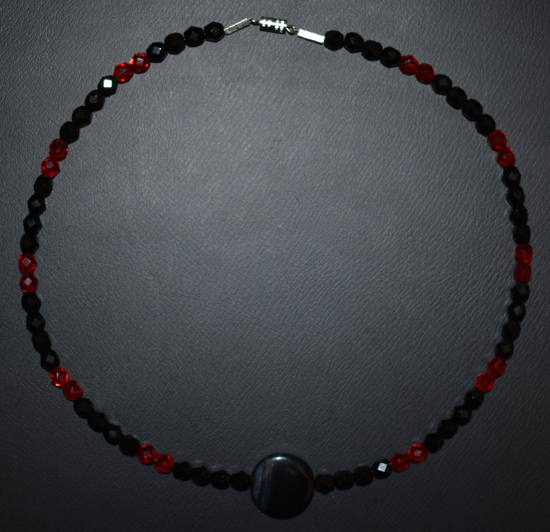 Designed by AT3META. This whimsical strand features faceted red and black Czech glass beads, and a flat stone circle bead. Measures 18.5" in length. Has a durably fastened screw closure.